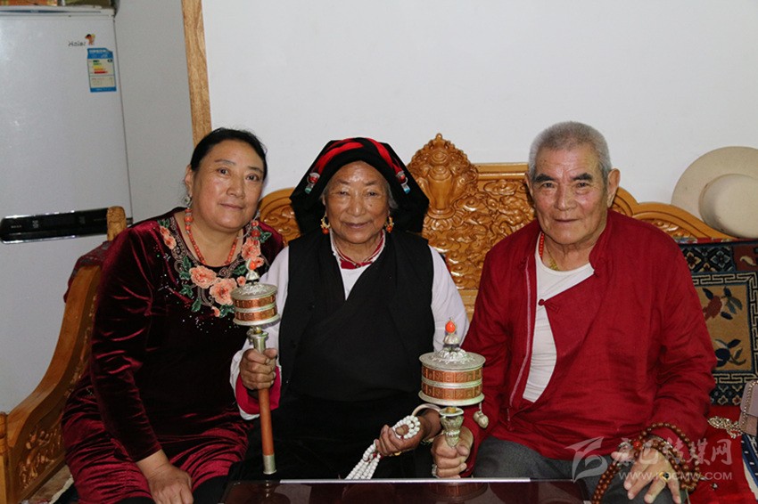 過了一會兒,兩位步履蹣跚的老人先后走了進來。其中,一位杵著拐杖,一位搖著經筒。“喝茶、喝茶。”見到記者一行,老人十分熱情。
