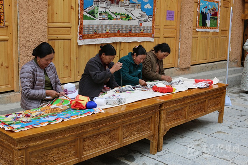 在藏繡展點,5名農(nóng)牧民婦女正在合繡一幅藏族建筑刺繡作品。“我從16歲開始跟著父親學(xué)藏繡,傳到我這已經(jīng)是第四代了。除了‘六長壽’、度母像等傳統(tǒng)圖案,今年是新中國成立70周年,我還繡了一幅天安門作品?!?7歲的傳承人達(dá)打介紹道。