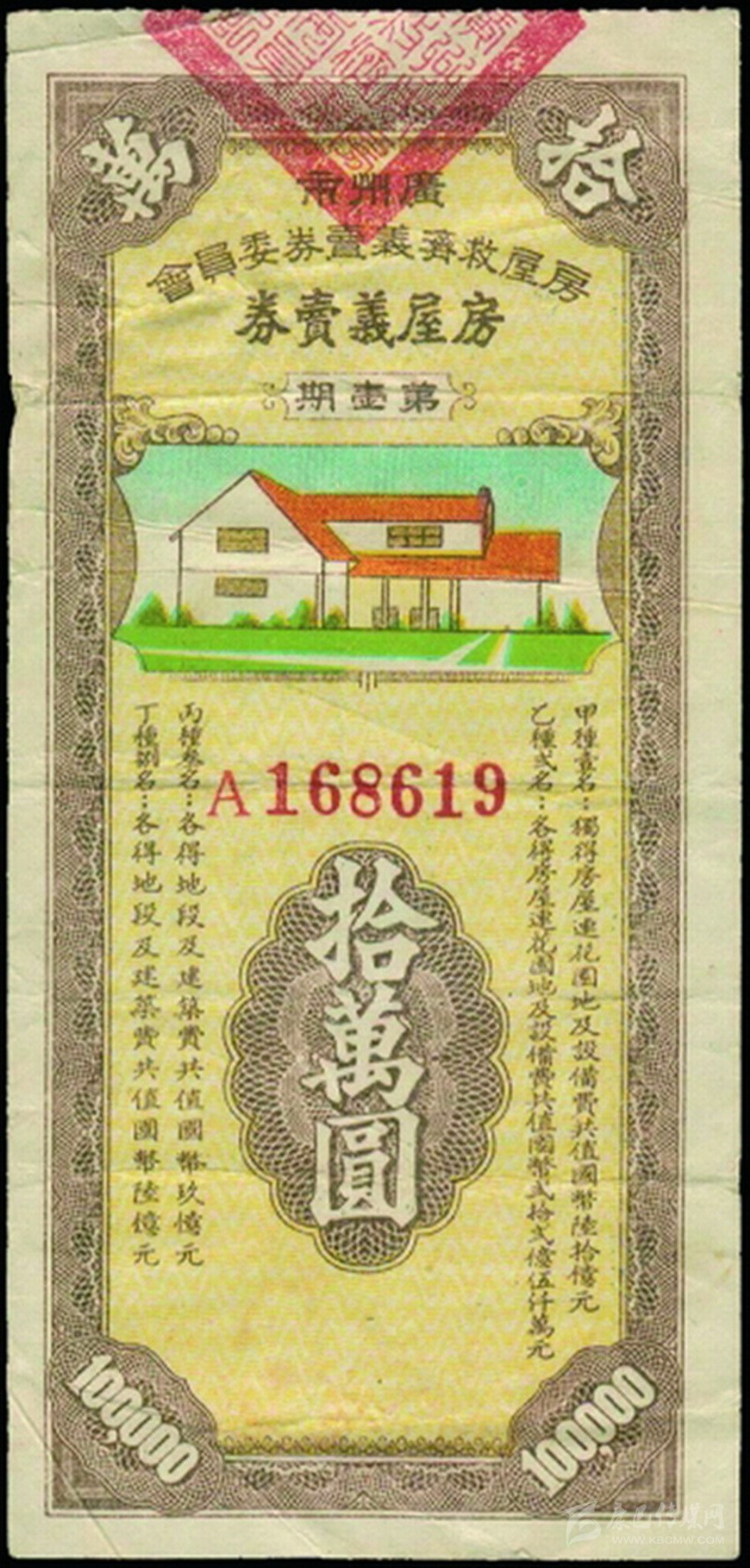 1948年2月,廣州市房屋救濟義賣券委員會每月發(fā)行一次房屋義賣券。第一期房屋義賣券面值10萬元,共發(fā)行30萬張。設甲、乙、丙、丁種中獎者各1、2、3、8名,其中甲種獨得房屋連花園地及設備費共值國幣六十億元,乙種各得房屋連花園地及設備費共值國幣二十二億元五千萬元,丙種和丁種得土地及建筑費分別值九億元、六億元。第二期房屋義賣券仍發(fā)行30萬張,但每張面額上升到國幣20萬元,獎項變?yōu)橹歇務呒追N1名,獨得房屋兩間及設備費十億元;乙種2名,各得房屋兩間;丙種3名,各得房屋一間另設備費五億元;丁種4名,各得房一間。
