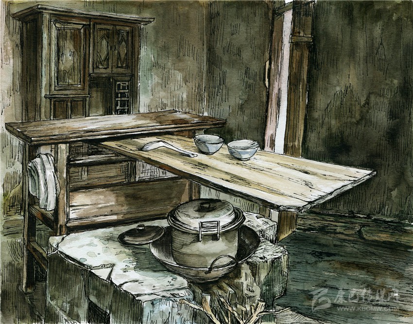 在我們家,灶屋里砌著一個(gè)四方形兩灶孔的大正灶,兩條寬板長(zhǎng)凳靠墻擺放,交于墻角,像木匠的大曲尺,半圍著象征一家之主的正灶,其中一條正對(duì)著灶門口。灶與凳之間的通道,僅容曲膝而坐。灶上常年擱著烏黑的鼎灌和鐵鍋,灶的背面則立著一張長(zhǎng)條狀的灶桌。灶桌是洗碗和切菜的地方,在其橫長(zhǎng)的縫隙里插上接手板,懸空于灶面之上,擺上碗筷,又起到了飯桌的功能。灶屋進(jìn)門的另一面墻,靠墻而立的,是高高的碗欃和一個(gè)瓦水缸。碗欃是平素放碗放剩菜的地方,本是漆了老紅色,卻因西墻的木格窗小,光線幽暗,與四壁及樓板的烏黑融為了一體。水缸上口有一塊擱板,板上放兩只寬口瓦缽,缽里各放著一只竹筒水勺,一大一小。每天早晚,家人擔(dān)了木桶,挑來(lái)井水倒入水缸,此處的地面,長(zhǎng)年潮濕。灶屋是我們一日三餐吃飯喝茶休息閑談的場(chǎng)所,煙火歲月,多是在此度過(guò)。我開(kāi)蒙上小學(xué)后,每到夜晚,吃過(guò)飯后,將煤油燈盞移到寬板長(zhǎng)凳,雙膝跪地,伏在凳灶之間的空隙里寫作業(yè),有時(shí)一不小心,額前頭發(fā)就被燈盞的火焰燒得焦臭。我自小愛(ài)學(xué)習(xí),成績(jī)很好,每學(xué)期都有獎(jiǎng)狀,老師夜里來(lái)村間家訪時(shí),也常來(lái)我家坐,是我父母最大的榮光。