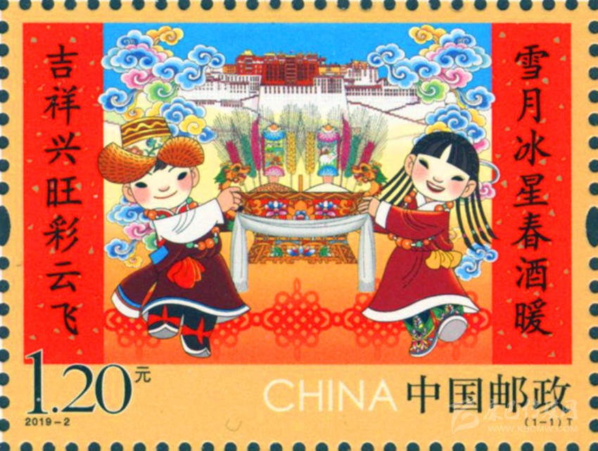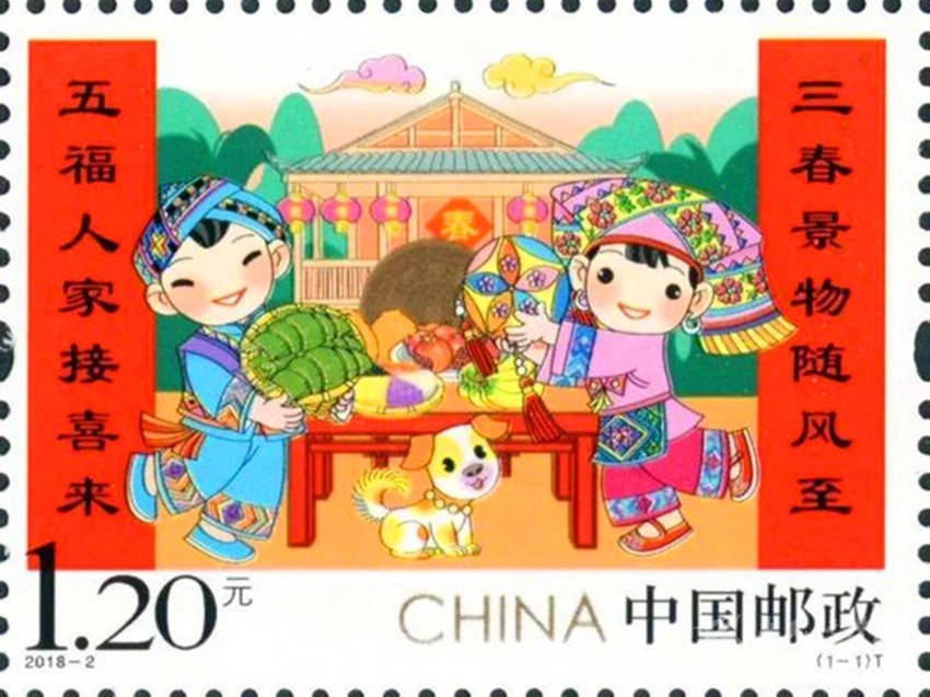 彰顯中華民族特有人情味的拜年郵票。拜年是我國春節(jié)的主要習(xí)俗,是中華民族優(yōu)秀的傳統(tǒng)文化,是人與人之間情感凝聚和維系的重要禮節(jié),具有獨特人情味。中國郵政從2015年至2019年連續(xù)發(fā)行了五組“拜年”系列郵票。2015年中國郵政發(fā)行的第一組《拜年》郵票,以其獨特的卡通風(fēng)格和濃郁的民俗特色,展現(xiàn)了人們過大年,拜大年時的喜悅場景。2018年正好是廣西壯族自治區(qū)成立六十周年,中國郵政發(fā)行 《拜年》郵票,畫面展現(xiàn)了壯家人過年時熱情好客的場景,桌子上擺放著柚子、香蕉、五色飯等當(dāng)?shù)靥厣褪澄?,打開的石榴籽粒飽滿、顆顆相抱,正如我國56個民族緊密團(tuán)結(jié)在一起,形象貼切地體現(xiàn)了習(xí)近平總書記提出的“各民族要像石榴籽那樣緊緊抱在一起”的教導(dǎo)。 2019年春節(jié)恰逢與藏歷新年同一天,中國郵政發(fā)行的《拜年》郵票,郵票主圖畫面上“歡歡”與“喜喜”兩名藏族兒童,身穿藏族的盛裝,在布達(dá)拉宮前載歌載舞,整個畫面展現(xiàn)了藏族同胞歡快愉悅,喜慶新年的畫面,同時也表達(dá)了全國各族人民在黨的領(lǐng)導(dǎo)下,幸福生活,共筑中國夢的美好寓意。