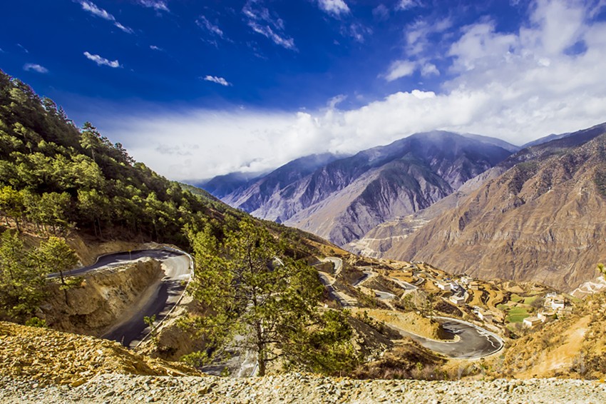 如今,所有鄉(xiāng)村通了硬化路,橫跨在金沙江上的十余座跨江大橋氣貫如虹,天塹變通途。過去我們下鄉(xiāng)時(shí),從日雨到曲雅貢,只有一條從因都?jí)伪澈蟮陌肷窖?。蒼茫大山,路上幾乎看不見一顆大樹,也找不到一滴水源。從山腰看江畔的因都?jí)?,只有兩戶人家,幾株綠樹總令焦渴難耐的我們望“綠”興嘆!下山走到金沙江邊,熾烈陽光從河灘上反射,火辣辣照在臉龐和皮膚,熱浪令人窒息,感覺目的地遙不可及?,F(xiàn)今,干部下村完全不需要走路,走路下鄉(xiāng)對(duì)年輕人來說簡(jiǎn)直不可思議。公路像一條飄帶環(huán)繞山間,使散落在峽谷中的村寨愈發(fā)展現(xiàn)出欣欣向榮的新風(fēng)貌。