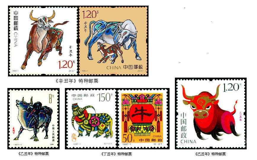 1997年1月5日發(fā)行第二輪生肖郵票中的“牛票”,即《丁丑年》特種郵票,全套2枚。由郵票設(shè)計師呼振源設(shè)計。第一枚“金牛奮蹄”,畫面依據(jù)山東省高密縣方市鄉(xiāng)前曹戈莊村當(dāng)時33歲的農(nóng)村女子齊秀花的剪紙作品《媳婦騎牛圖》進(jìn)行設(shè)計,原作中的“媳婦”被刪去,突出了牛的形象,體現(xiàn)出膠東地區(qū)民間剪紙藝術(shù)源于生活、構(gòu)思巧妙、粗獷中多見細(xì)膩的本色。只見那彎彎的牛角,垂地的長尾,壯實(shí)的牛身,穩(wěn)健的四蹄,都真實(shí)地再現(xiàn)了生活中牛的特點(diǎn),牛身上似花非花,似銅錢又非銅錢的紋飾,充分地表現(xiàn)出樸實(shí)的浪漫主義。第二枚“牛耕年豐”,畫面主圖為一只高高掛起的大紅燈籠上,映出了一個醒目的隸書“牛”字,為牛年的慶春象征。圍繞著這只燈籠,又進(jìn)行了幾多創(chuàng)意,兩只喜鵲和一朵梅花,喻意“喜鵲登梅”;旒蘇上的兩朵牡丹,代表幸福、富貴;特別是那春意盎然的“雙牛圖”,畫面雖小,確為點(diǎn)睛之筆,與主圖的大“?!弊志o密呼應(yīng)。