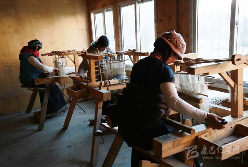 2003年,“編織班”邀請(qǐng)澤巴姆為老師,將這項(xiàng)技藝傳承了下來(lái)。現(xiàn)在,澤巴姆年紀(jì)大了,牛羊毛絨編織這樣繁復(fù)又耗體力的事情她不再做了,全交給了自己的媳婦扎西巴姆——當(dāng)?shù)匚ㄒ坏呐Q蚪q編織老師。第二天,我們?cè)诰幙棸嗟墓し焕镆?jiàn)到了扎西巴姆。工坊一角的木架上擺著為數(shù)不多的圍巾、墊毯等產(chǎn)品,窗邊平行擺著六臺(tái)織機(jī),扎西巴姆正帶著幾個(gè)藏族婦女坐在其間飛梭走線。陽(yáng)光從窗戶透進(jìn)來(lái),投射在織機(jī)和織女們身上,古老的場(chǎng)景、緩慢的節(jié)奏恍惚把我?guī)Щ亓俗婺傅臅r(shí)代。扎西巴姆說(shuō),當(dāng)?shù)厝朔Q(chēng)牦牛絨為