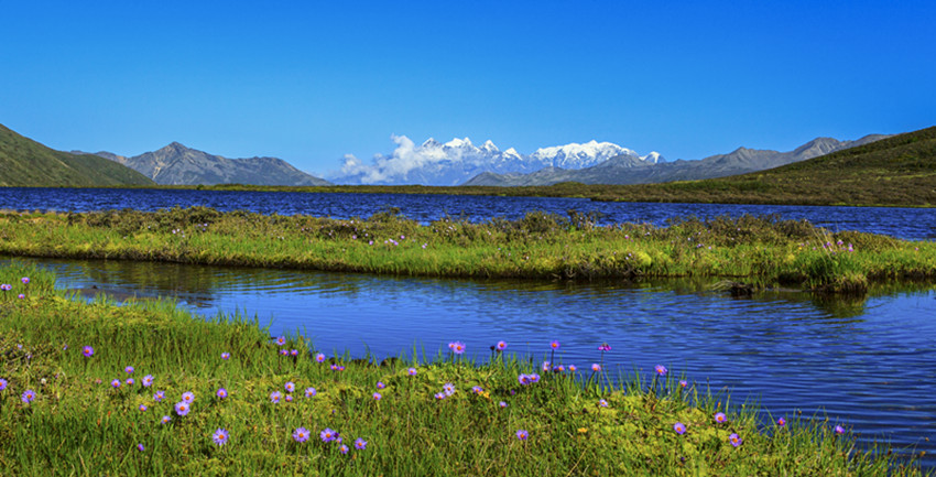 在山谷中穿行十余公里,路面一點(diǎn)點(diǎn)抬起,上了貢嘎山脈,徑直進(jìn)入康定情歌景區(qū)。隨著海拔的升高,涼意漸濃。山依舊是主角,地勢卻變得平緩而開闊,有茵茵的草地,有大小湖泊,沿途山泉潺潺,野花點(diǎn)綴,空氣清幽,方才單調(diào)的褐色很快被淡忘。山體漸次出現(xiàn)密集而低矮的灌木,枝條筆直地立著,有高寒山區(qū)的凜然之氣。灌木一層層上延,樹木雜多,大片的原始森林漫過山體,將大山包裹起來。遠(yuǎn)處,藍(lán)天白云之下,貢嘎雪山在群峰中探出頭來,擦亮高空的陽光。澄明的空氣里,仿佛可以聽見雪??┛┑匦?。剎那間,仿佛所有的大山,都開始舒展筋骨。