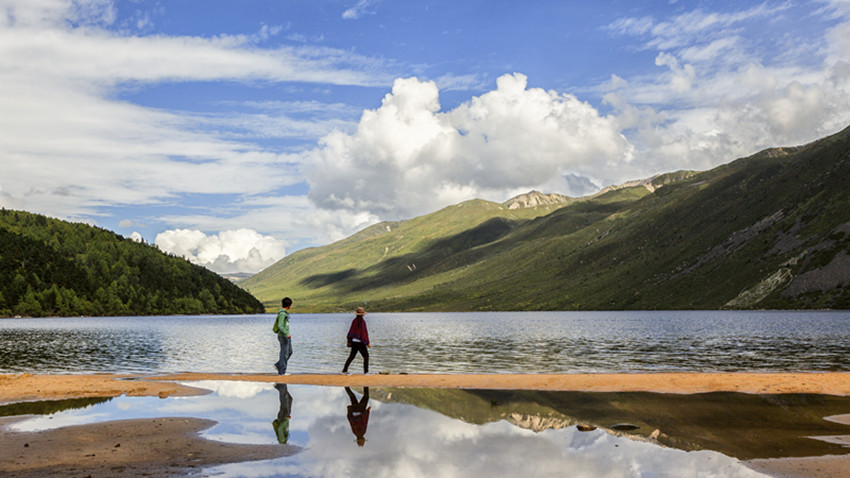木格措特殊的位置和完好的生態(tài),造就了“一日四時(shí)景、早晚不同天”的自然奇觀。高原的第一縷晨光越過遠(yuǎn)峰,均勻地鋪灑在木格措湖面,湖水蘇醒過來,水面煙波浩渺,薄紗飛卷,如同早起后對鏡梳妝的仙女。午后有微風(fēng),遠(yuǎn)處湖面靜若處子,近前卻有微瀾拂岸,動靜之間,盡得自然自在。斜陽西下,余暉投灑在水面上,湖水濃墨重彩,任意涂抹,水天一體,你我也融合在靜謐的湖光夜色中了。