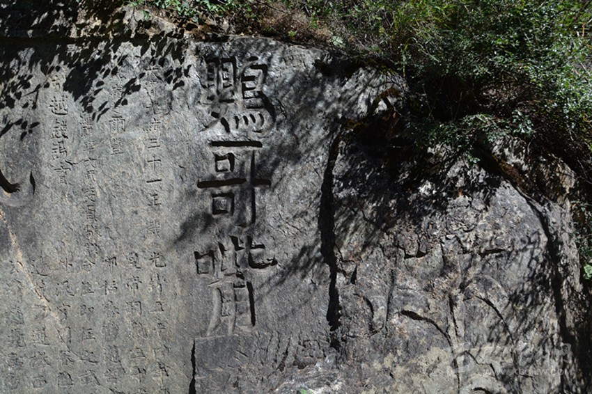 《竺國通衢》刻在一顆大石頭的下部,石高約三米,長約六米,刻于清道光年間,意為通向印度的通道,充分說明這條道路的價值和作用。大石和字已藏在核桃樹下,勢大必難除,加之雨水侵蝕下已風化嚴重。