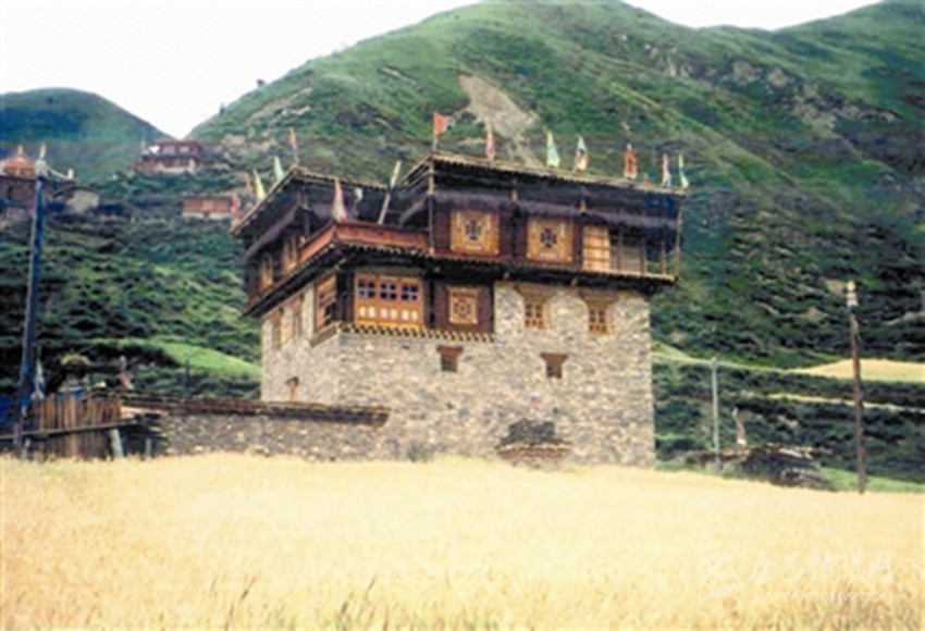 色爾壩藏寨以石頭、泥土、木頭為主要建筑原材料,絕不用水泥、鋼材等現(xiàn)代建材,甚至屋頂也不用瓦片,全部采用泥土,取材十分簡單、方便,然而因?yàn)樾藿ㄈ咳斯?,工期較長,需要2-4個月或更長時間。當(dāng)?shù)赝诵莞刹控晠s秋告訴筆者,藏寨房屋層數(shù)有較嚴(yán)格的規(guī)定,普遍為3—4層,不少于3層,也不會高于4層,分別象征一個人的頭部、胸部、腹部和腿;底層一般用來關(guān)牲畜或堆放雜物,第二層存貯糧食,第三層居住,第四層設(shè)置佛堂,這種建筑風(fēng)格不同于周邊爐霍、道孚、丹巴民居,自成一體。藏寨造型完全擬人化,外形奇特,上大下小呈倒立的品字形,猶如一個頭戴盔甲、身披戰(zhàn)袍的將軍;房屋上層樓廊外部均以高山柳條垂掛環(huán)繞,以象征大將色爾哇·尼崩達(dá)雅的披肩長發(fā);房頂正中的小旗幟就象將士頭盔上的帽纓;房屋右側(cè)隨風(fēng)飄拂的經(jīng)幡,恰似將軍手握長矛在沖鋒陷陣。房屋依山而建,傍山而立,外形高大雄偉。深厚的格薩爾文化為藏寨蒙上了一層神秘的面紗。