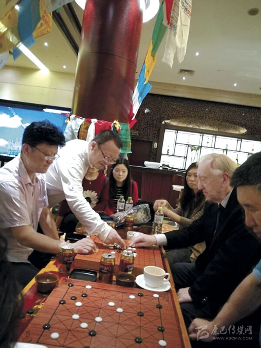 藏族群眾與外國(guó)藏棋研究學(xué)者交流藏棋文化。