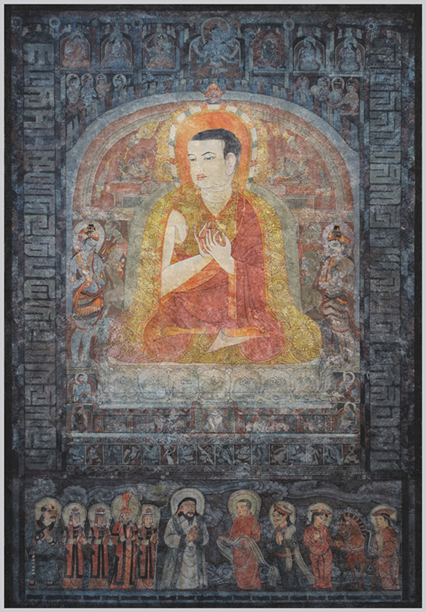 工筆畫(huà)作品《大元帝師八思巴》是我在2012年創(chuàng)作的,該作品表現(xiàn)了歷史上西藏高僧八思巴的英偉形象和他的傳奇經(jīng)歷。作品畫(huà)心寬約105厘米,高約152厘米,八尺云龍紙裁小使用。材料包括:礦物顏料、植物顏料、水彩顏料和丙烯顏料等。賦色方面使用礦物顏料在生紙上皴擦出滄桑的斑駁美感。用深淺冷暖來(lái)讓八思巴坐像和“六盤(pán)山相聚”在畫(huà)面上顯現(xiàn)出來(lái),而其他內(nèi)容則逐漸隱藏于漫漶的背景里面。畫(huà)面正中身著華美僧衣者就是薩迦五祖之八思巴,他有著昆氏家族的尊貴容貌、有著薩迦法王教主的莊嚴(yán)神態(tài);他雙手結(jié)轉(zhuǎn)法輪印于胸前,跏趺坐于金剛法座之上,法臺(tái)正中的海螺正是薩迦派圣物。昆氏家族世代以“三怙主”(文殊菩薩、觀音菩薩和金剛手菩薩)化身而傳承教法至今,故教派寺院圍墻涂有象征“三怙主”的紅、白、藍(lán)三色,故又稱(chēng)“花教”;所以在畫(huà)面頂上主尊的位置分別是觀音、文殊、金剛手三位菩薩。