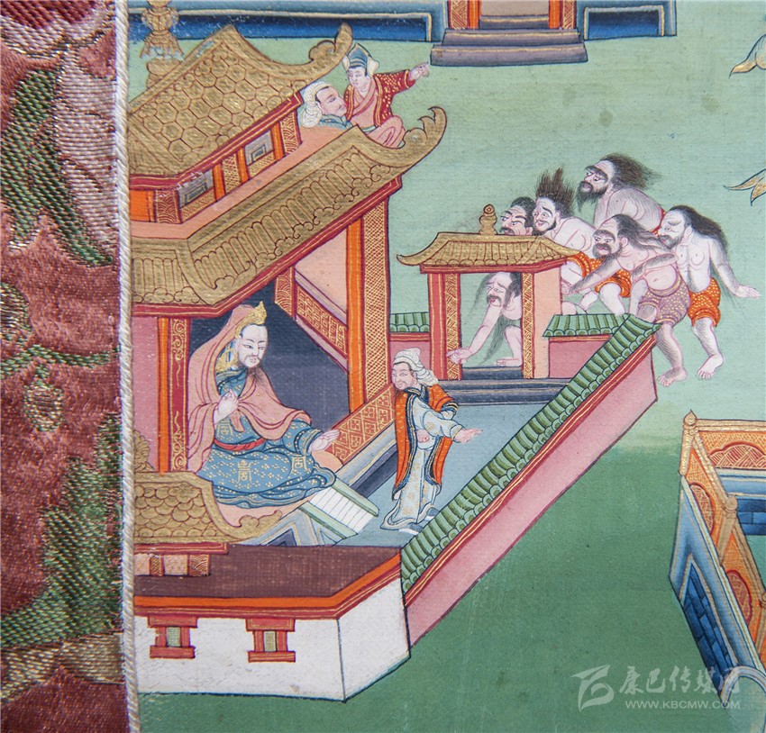 再看《如意寶藤》的另一個(gè)局部,對(duì)比唐卡裱邊,我們可以看出大約十公分見(jiàn)方的畫(huà)面里,郎卡杰描繪了十個(gè)人物和一棟宮殿,畫(huà)面還顯得很疏朗;圍墻外的“邪魔外道”身上不僅分染了體積,還描繪了五官須眉和汗毛。漢式宮殿內(nèi)外墻磚上,還刻畫(huà)了精微的花紋和裝飾,郎卡杰的“神變”畫(huà)技由此可見(jiàn)。而這樣的微型畫(huà)中畫(huà),在郎卡杰作品中大量存在,精彩絕倫。圖二《如意寶藤》局部