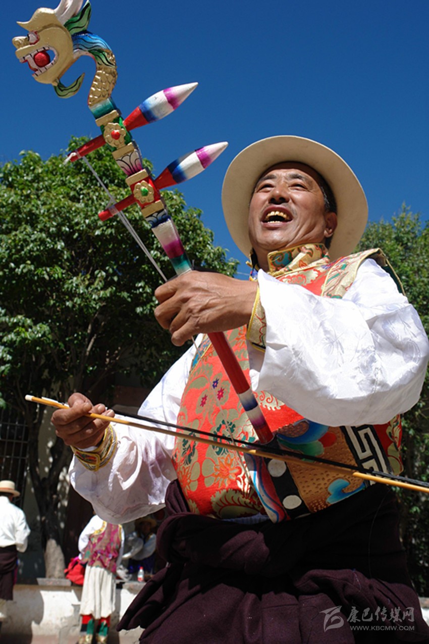 八歲時,就從外婆那里學(xué)會了拉“胡幾”,拉得不好,鄰居們笑:“咿咿呀呀的,像驢子在叫”。人們在田間地角跳弦子時,他夾在圈子里“臊堂子”調(diào)皮,后來便跟著大人跳,跳著跳著就學(xué)會了。有些動作不標(biāo)準(zhǔn),外婆和母親就會笑著糾正。1972年,縣上的“毛澤東思想文藝宣傳隊”選中了剛滿十四歲的他,在“文革”中后期鋪天蓋地的運動中,他們上山下鄉(xiāng)進軍營送文化,弦子舞技得到強化,藏二胡就是在這期間越拉越好的。那時候糧食還沒有過關(guān),公社分配的工分又重,家里的日子過得很艱難。經(jīng)常跟宣傳隊唱唱跳跳,可以不做那些繁重的農(nóng)活了,他還暗地里偷偷慶幸過?!拔母铩苯Y(jié)束后,縣上成立了業(yè)余弦子隊,他自然也在其中,這時,他已經(jīng)能記住二百多首弦子詞曲了。西藏恢復(fù)雪頓節(jié)那年,應(yīng)該是1986年吧,他們又跳到了圣地拉薩,受到了西藏各地官員和群眾的歡迎。客居拉薩的巴塘人在雪頓節(jié)盛典上看到巴塘弦子,流下了激動的淚水,很多人過來跟他們“打招呼”,問候家鄉(xiāng)人。跳弦子五十多年,去拉薩應(yīng)該是最難忘的事情了?!鞍桌瓫_!說拉薩道拉薩,拉薩建在海面上?!边@是小時候外婆教他唱的。和所有的藏族一樣,他從小就向往那塊圣地。八十年代交通極其不方便,去成都都要走整整四天,去拉薩多難啊,所以村里人都很羨慕他們弦子隊。他還記得,在向布達拉宮虔身朝拜的那一刻,他流下了感動和幸福的淚水。