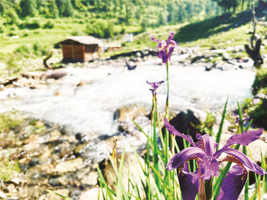 我走出木屋,朝著流動的水聲去梳洗。三兩只藍(lán)綠色的鳥兒立在插入溪水溝里的一截木槽上低頭飲水,抬頭鳴唱,見到人影,撲棱棱幾聲飛進(jìn)了不遠(yuǎn)處的一片淺樹叢里,沒了蹤跡。一層薄薄的白霧正從牧場后方皺褶起伏的山頂漫溢下來,湮沒了黛青色的山石、綠色的小杜鵑樹叢,接著湮沒了整個牧場,眼前一片空茫,耳邊只有溪水婉轉(zhuǎn)流向遠(yuǎn)處的聲音。我蹲下身,把手伸進(jìn)溪水里,由雪水融化的沁涼很快冷冽到了骨頭里,再往深處,觸摸到一個個光滑的圓石。浸泡久了,溪水開始變得柔軟溫暖起來,掬一捧洗臉,那清爽仿佛能使我一眼看開眼前的云霧,看清那些停立于山頂石礫之上的灰色獐子和樹叢深處悄然綻開的紫色貝母花,花瓣上星星點點的白是它與生俱來的喜色。