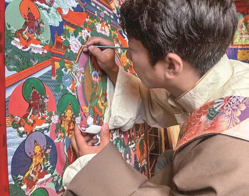 “唐卡作為中國(guó)民族繪畫(huà)藝術(shù)的珍品,不僅呈現(xiàn)精湛的技藝和美學(xué),更是傳遞一種文化?!睏畹潜硎荆鳛橐幻h級(jí)非遺傳承人,要在繼承傳統(tǒng)技藝的基礎(chǔ)上,采用多元藝術(shù)技藝賦予傳統(tǒng)唐卡更多創(chuàng)意,讓民族文化瑰寶能夠更好地發(fā)揚(yáng)光大。