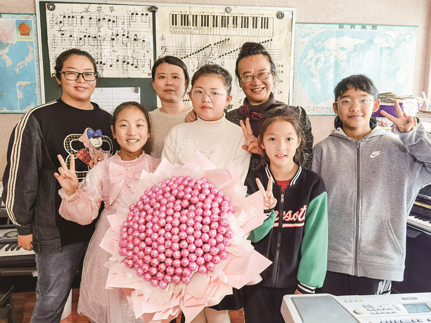 獲得榮譽后,肖欣蕊和老師、同學分享快樂。 受訪者 供圖