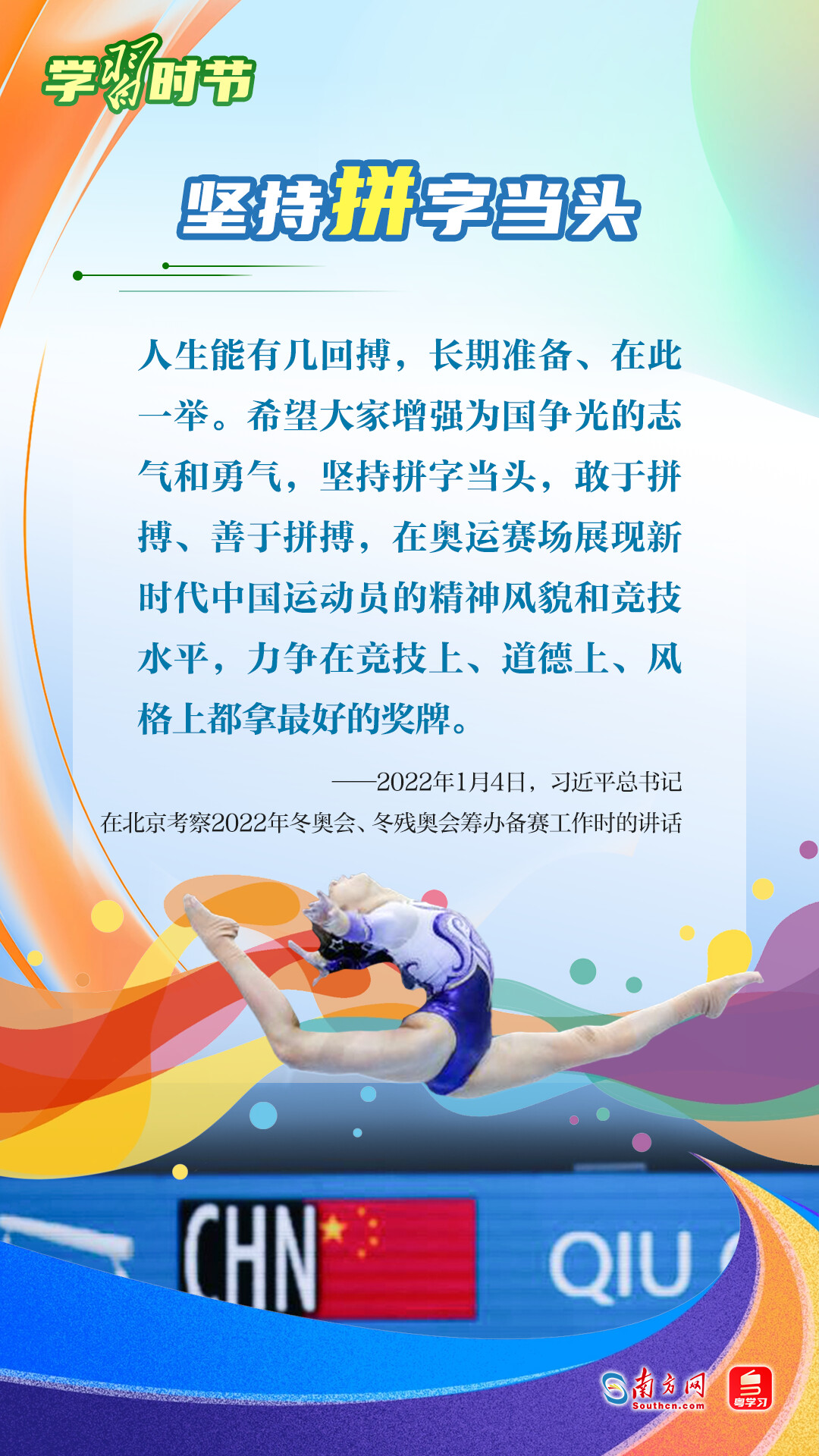 “我們不以勝負論英雄,同時英雄就要敢于爭先、敢于爭第一?!绷?xí)近平總書記曾在不同場合論述奧林匹克精神,深刻闡明了勝與負、成與敗的辯證關(guān)系,對奧林匹克“更快、更高、更強——更團結(jié)”的格言進行詮釋。讓我們一同學(xué)習(xí)習(xí)近平總書記對奧林匹克精神的重要論述,心懷夢想、奮勇拼搏,攜手走向美好明天。