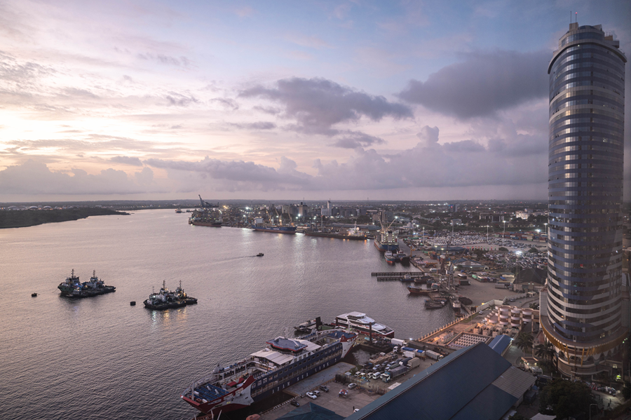 ??這是2023年12月29日拍攝的日出時(shí)分的坦桑尼亞達(dá)累斯薩拉姆港。新華社記者 王冠森 攝