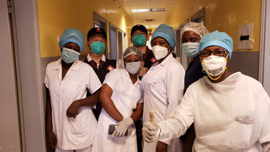 ??2020年5月26日,中國(guó)抗疫醫(yī)療專家組在剛果(布)首都布拉柴維爾指導(dǎo)新冠肺炎病房建設(shè)時(shí),與當(dāng)?shù)匾痪€醫(yī)務(wù)人員合影。新華社發(fā)