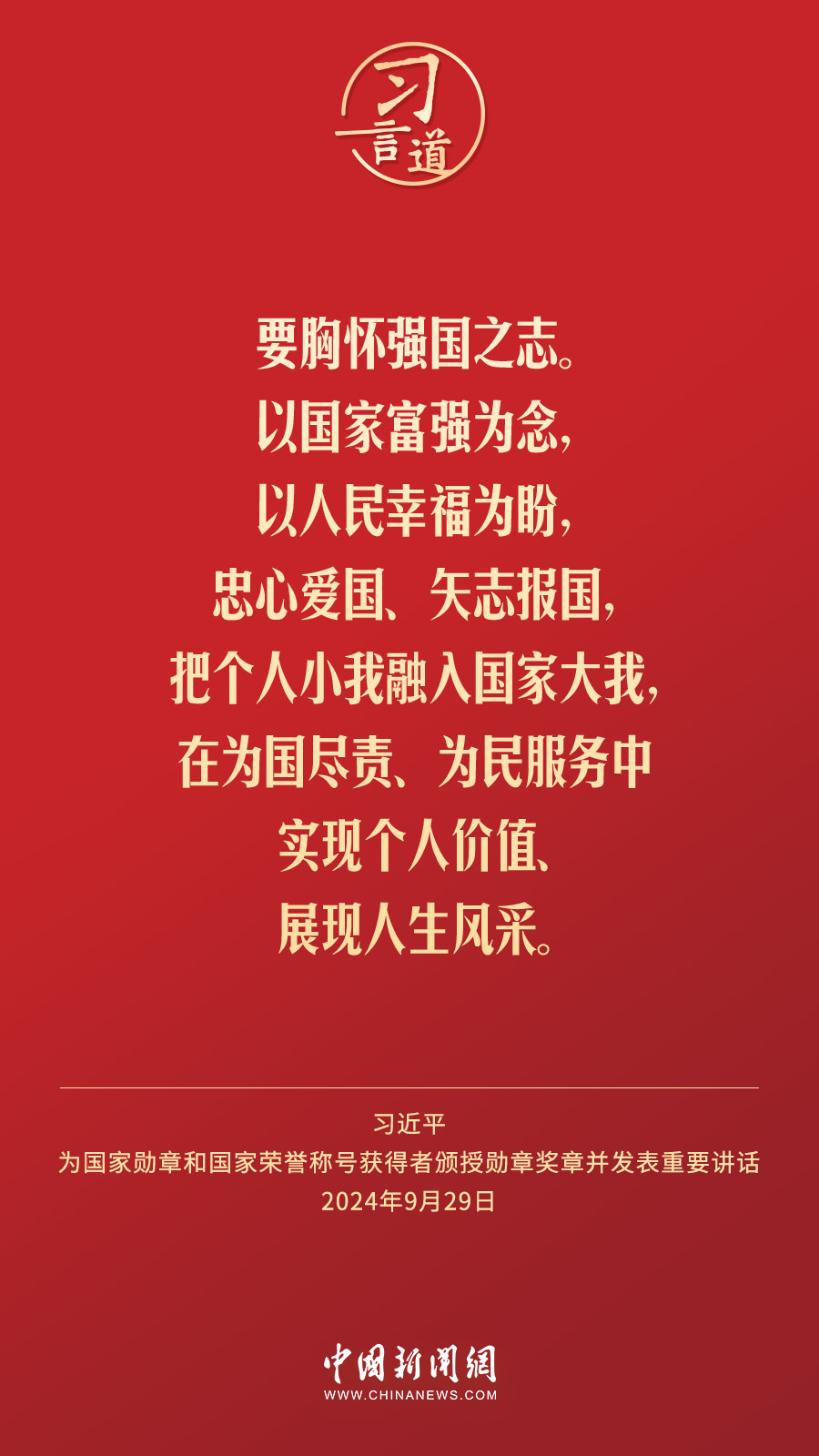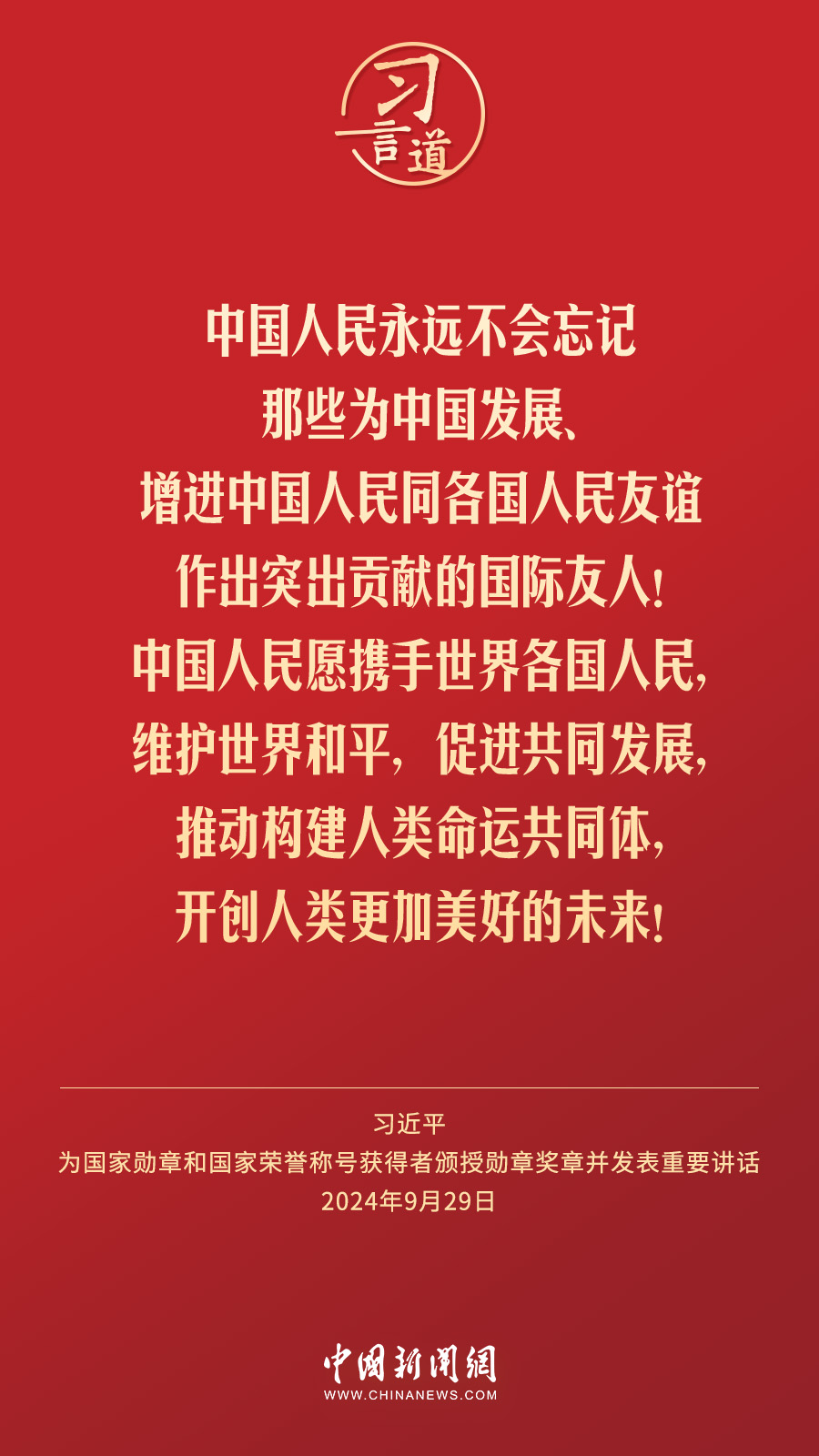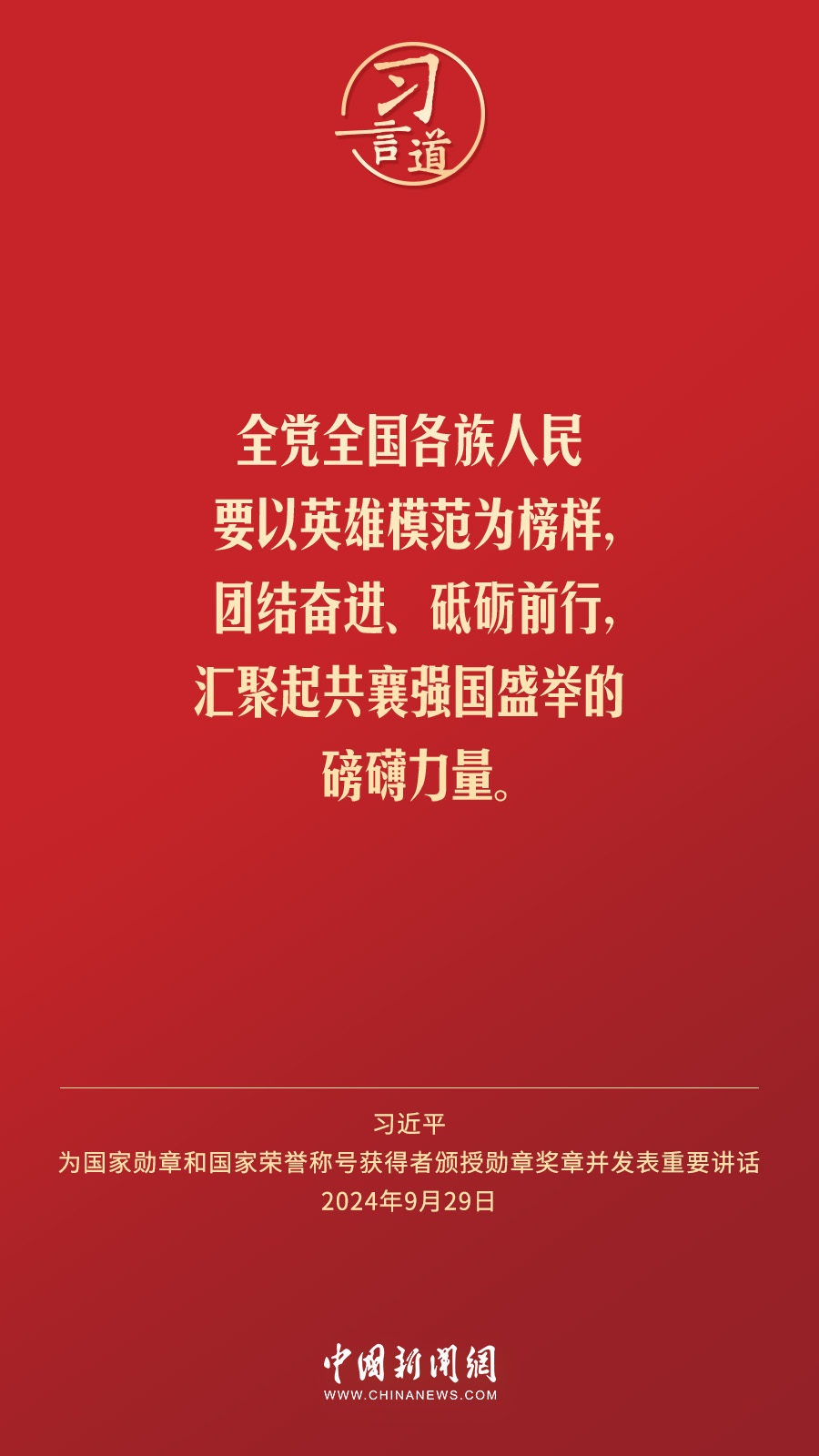 經(jīng)中共中央批準,中華人民共和國國家勛章和國家榮譽稱號頒授儀式于9月29日上午10時在人民大會堂隆重舉行。中共中央總書記、國家主席、中央軍委主席習(xí)近平向國家勛章和國家榮譽稱號獲得者分別授予“共和國勛章”“友誼勛章”和國家榮譽稱號獎?wù)虏l(fā)表重要講話。習(xí)近平指出——