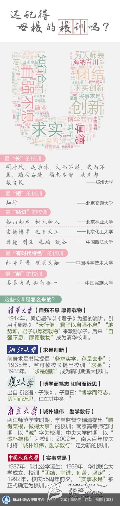 一份對(duì)100多所中國(guó)高等學(xué)府校訓(xùn)的統(tǒng)計(jì)顯示,出現(xiàn)頻次最高的詞是“求實(shí)”,其次是“創(chuàng)新”、“博學(xué)”、“厚德”,一個(gè)‘實(shí)’字始終貫穿于不同時(shí)代、不同環(huán)境的校訓(xùn)之中。