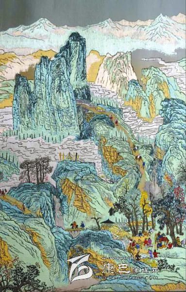 在蜀錦蜀繡展覽館中,由蜀錦大師馬德坤,蜀繡大師鄔學(xué)強(qiáng)共同創(chuàng)作大型錦繡作品《南方絲路圖》,吸引不少游客駐足。該作品天空部分的藍(lán)色由深及淺,并逐步過(guò)渡到表現(xiàn)地面的泥金色。同時(shí),利用絲織品的透光性,使遠(yuǎn)山和近景形成強(qiáng)烈對(duì)比,大大地增強(qiáng)了畫(huà)面的縱深感。