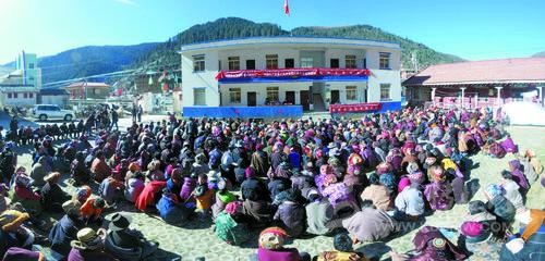 離水洼鄉(xiāng)政府三十余里的那拉崗村中澤一家三口為了避開(kāi)“桑然路”限行時(shí)間,大清早就從村里出發(fā)到鄉(xiāng)政府等候宣講團(tuán)的到來(lái)。“十八大召開(kāi)后,我們村里路通了,家里有電了,小孩上學(xué)也不要錢(qián)了,我很想知道十九大會(huì)有什么好政策?!敝袧杉?dòng)地說(shuō)。因?yàn)橹乐菸罕娦v團(tuán)上午要到寺廟宣講,桑披寺的僧侶傾真比平時(shí)早起兩小時(shí)做早課。而在尼斯鎮(zhèn)的宣講現(xiàn)場(chǎng),宣講團(tuán)的汽車(chē)被前來(lái)聽(tīng)宣講群眾的摩托車(chē)和小車(chē)堵得水泄不通。