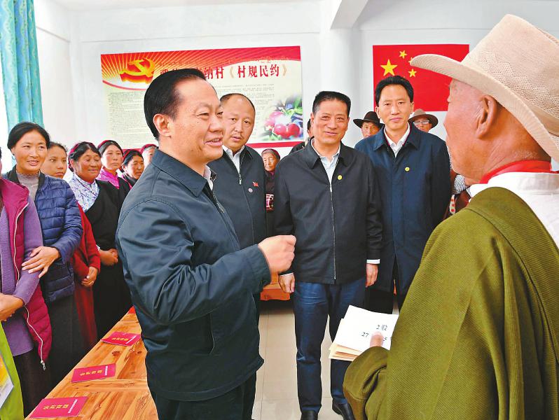 在村民澤翁家中,彭清華細致察看整修后的旅游民宿,了解房屋結(jié)構(gòu)功能、抗震設(shè)防標(biāo)準(zhǔn)和修建費用等,與一家人拉家常、聊增收,鼓勵他們再接再厲,把日子越過越好。雅德鄉(xiāng)交納村平均海拔3300米,是典型的高原藏區(qū)貧困村。彭清華沿著崎嶇的山路步行來到貧困戶亞瑪忠登和根呷家中,與他們圍坐在一起,共同分析致貧原因和脫貧進展,詳細了解各項幫扶措施落實情況,為他們脫貧增收鼓勁支招。在交納村村委會辦公室,彭清華與在這里參加合作社入股分紅活動的村民們親切交談。他對在場的村干部和鄉(xiāng)親們說,習(xí)近平總書記、黨中央十分牽掛藏區(qū)群眾,對扎實做好藏區(qū)經(jīng)濟發(fā)展、民生改善和社會和諧穩(wěn)定特別是脫貧攻堅等方面工作作出一系列重要指示、提出明確要求。我們要認(rèn)真學(xué)習(xí)領(lǐng)會、堅決貫徹落實。希望鄉(xiāng)親們始終銘記習(xí)近平總書記的深切關(guān)懷,進一步堅定脫貧信心,大力發(fā)展生產(chǎn),積極學(xué)習(xí)技術(shù),尤其要重視孩子們的培養(yǎng)教育,讓適齡少年兒童都能接受義務(wù)教育,堅決阻斷貧困代際傳遞。要充分發(fā)揮群眾的積極性和主動性,引導(dǎo)村民依靠自己的辛勤勞動拔窮根、摘窮帽,早日脫貧致富奔小康。