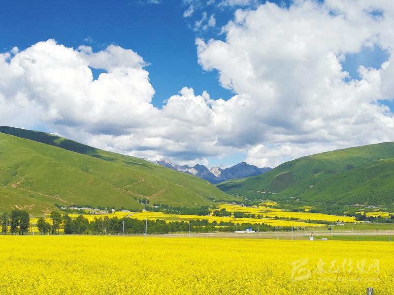 成都市郫都區(qū)對口援建的甘孜州道孚縣協(xié)德鄉(xiāng)萬畝油菜基地一片生機盎然。 陳凱 攝