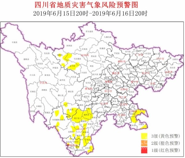 四川在線消息(記者 寇敏芳)6月15日,省自然資源廳發(fā)布全省地災(zāi)氣象風(fēng)險(xiǎn)預(yù)警。結(jié)合四川省氣象臺(tái)天氣預(yù)報(bào)情況,6月15日20時(shí)~6月16日20時(shí),全省地質(zhì)災(zāi)害氣象風(fēng)險(xiǎn)預(yù)警等級(jí)為3級(jí)(黃色預(yù)警,注意級(jí)),具體結(jié)果如下: