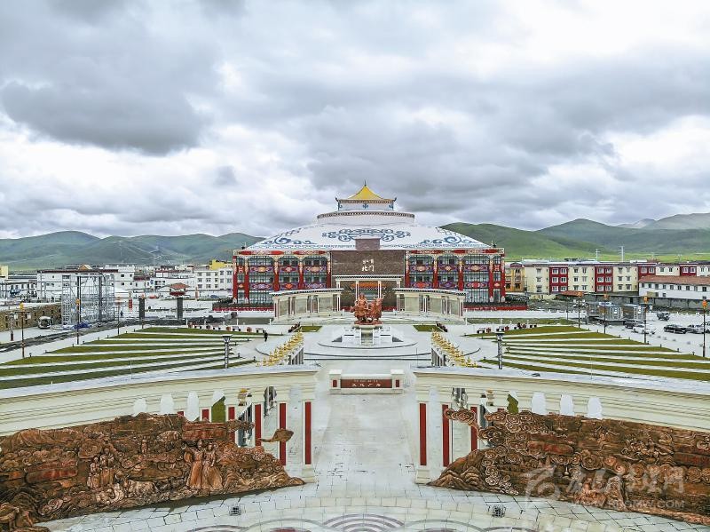 活動中心最“惹眼”的建筑,是一棟外形神似牧區(qū)帳篷的三層主體建筑。主體建筑的頂部,借鑒了石渠縣色須寺的外形設計,建筑外部的壁畫均為當?shù)厥止に嚾擞H手繪制。活動中心的廣場上,以微縮的形式展現(xiàn)石渠縣最具代表性的景點,如石經(jīng)城、石經(jīng)墻等。