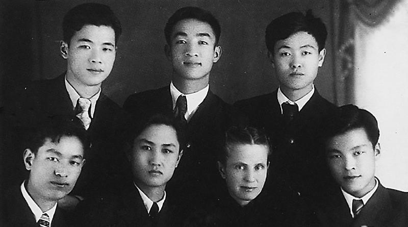 1949 年 6月1日,李鵬同志(后排左)在蘇聯(lián)伊萬諾沃動力學(xué)院補習(xí)數(shù)理化及俄文時與俄語教師費德洛娃(前排左三)及同學(xué)合影。 新華社發(fā)