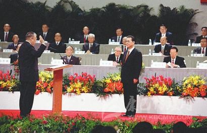 1998年5月5日,全國人民代表大會澳門特別行政區(qū)籌備委員會在北京人民大會堂宣告成立并舉行第一次全體會議。這是李鵬同志為籌備委員會副主任委員何厚鏵頒發(fā)任命書。 新華社記者 鞠鵬 攝