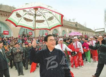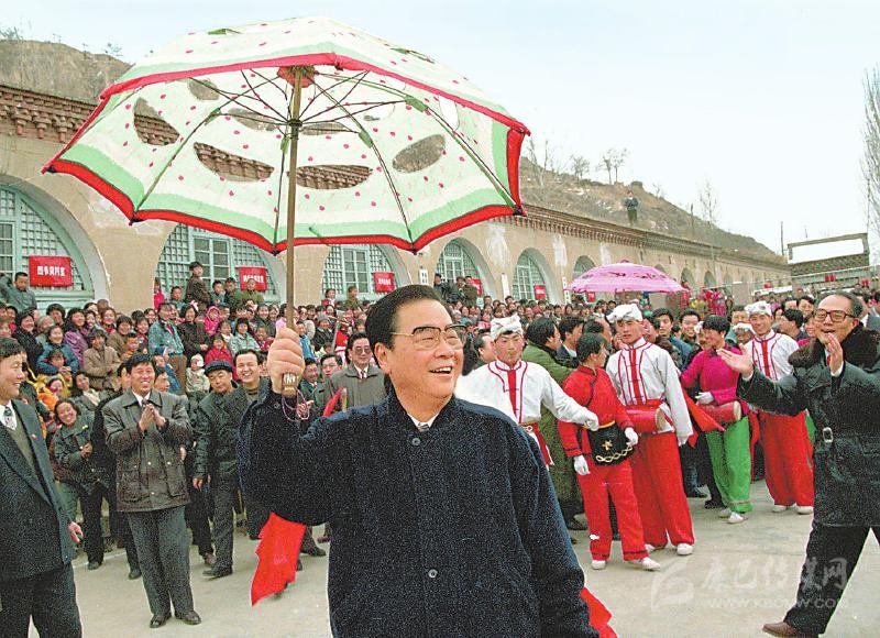 1996年2月19日至20日,李鵬同志回到闊別50年的延安,看望、慰問延安地區(qū)的干部群眾,和老區(qū)人民一起過年。這是大年初一,李鵬同志同棗園村秧歌隊一起扭起陜北大秧歌。新華社記者 劉建國 攝