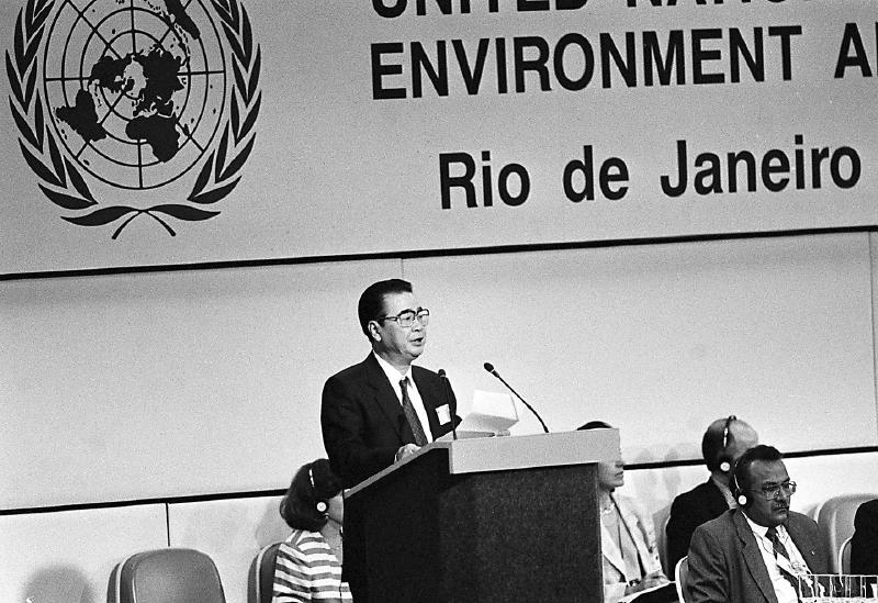 1992 年 6月12日,李鵬同志在聯(lián)合國環(huán)境與發(fā)展大會首腦會議上發(fā)言。 新華社記者 李生南 攝