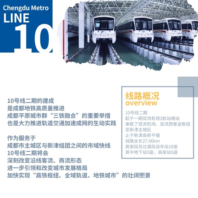 10號(hào)線二期起于一期雙流機(jī)場(chǎng)2航站樓站,串聯(lián)了雙流機(jī)場(chǎng)、雙流西客運(yùn)樞紐至新津主城區(qū),止于新津縣新平鎮(zhèn),線路全長27.06km,高架段及過渡段設(shè)車站10座,其中地下站5座,高架站5座。