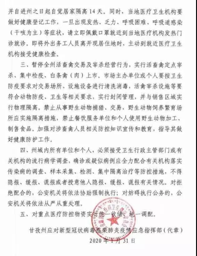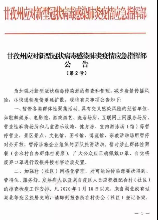 一、暫停各類群體性聚集活動(dòng)。具有交叉感染風(fēng)險(xiǎn)的經(jīng)營(yíng)單位,如歌舞娛樂(lè)、電影院、游戲游藝、洗浴場(chǎng)所、互聯(lián)網(wǎng)上網(wǎng)服務(wù)場(chǎng)所、營(yíng)業(yè)性麻將場(chǎng)所和兒童游樂(lè)設(shè)施、健身房、室內(nèi)游泳場(chǎng)(館)等暫停營(yíng)業(yè),景區(qū)景點(diǎn)、文化館、圖書(shū)館、博覽館、宗教活動(dòng)場(chǎng)所暫停對(duì)外開(kāi)放,暫停涉旅企業(yè)組織的團(tuán)隊(duì)旅游活動(dòng)。暫時(shí)禁止群體性聚餐(含農(nóng)村自辦群體性宴席)。廣大公眾應(yīng)正確佩戴口罩,自覺(jué)將廢棄口罩進(jìn)行毀損并按有害垃圾處置。二、加強(qiáng)村(社區(qū))網(wǎng)格化管理,對(duì)可能的傳染源要找得到、管得住、服務(wù)好。發(fā)熱病人以及來(lái)自疫區(qū)人員應(yīng)積極配合村(社區(qū))的排查檢疫工作安排。凡2020年1月10日以來(lái),來(lái)自湖北或有過(guò)湖北等疫區(qū)旅居史的,請(qǐng)即刻報(bào)告所在村委會(huì)(社區(qū))登記備案,并自進(jìn)州之日起自覺(jué)居家隔離14天。同時(shí),當(dāng)?shù)蒯t(yī)療衛(wèi)生機(jī)構(gòu)要做好健康登記工作,一旦出現(xiàn)發(fā)熱、乏力、呼吸困難、呼吸道感染(干咳為主)等癥狀,請(qǐng)立即佩戴口罩就近到當(dāng)?shù)蒯t(yī)療機(jī)構(gòu)發(fā)熱門診就診。即將外出務(wù)工人員離開(kāi)現(xiàn)居住地時(shí),主動(dòng)到就近醫(yī)療衛(wèi)生機(jī)構(gòu)接受健康檢查。三、暫停全州活畜禽交易及宰殺經(jīng)營(yíng)行為,實(shí)行活畜禽定點(diǎn)宰殺、集中檢疫、白條禽(肉)上市。市場(chǎng)主辦單位或個(gè)人要按衛(wèi)生防疫要求對(duì)交易場(chǎng)所、設(shè)施設(shè)備進(jìn)行清洗消毒,活禽宰殺設(shè)施等要符合動(dòng)物防疫、衛(wèi)生等相關(guān)要求,實(shí)行封閉管理,并與銷售區(qū)域?qū)嵭形锢砀綦x。禁止從事野生動(dòng)物捕獵、交易,野生動(dòng)物飼養(yǎng)繁育場(chǎng)所應(yīng)實(shí)施隔離措施,禁止餐飲服務(wù)單位和個(gè)人使用野生動(dòng)物加工、制售食品。加強(qiáng)對(duì)涉畜禽人員相關(guān)防控知識(shí)宣傳和教育,指導(dǎo)其做好健康防護(hù)工作。四、州域內(nèi)所有單位和個(gè)人,必須接受衛(wèi)生行政主管部門或有關(guān)機(jī)構(gòu)的流行病學(xué)調(diào)查,確診或疑似病例應(yīng)全力配合有關(guān)機(jī)構(gòu)落實(shí)傳染病的調(diào)查、樣本采集、檢測(cè)、集中隔離治療等防控措施,不得隱報(bào)、緩報(bào)、謊報(bào)或者授意他人隱報(bào)、緩報(bào)、謊報(bào)有關(guān)情況。對(duì)拒絕配合的,公安機(jī)關(guān)將依法協(xié)助強(qiáng)制執(zhí)行;對(duì)妨礙執(zhí)行公務(wù)的,公安機(jī)關(guān)將依法從嚴(yán)從重處理。五、對(duì)重點(diǎn)醫(yī)療防控物資實(shí)行統(tǒng)一收儲(chǔ)、統(tǒng)一調(diào)配。甘孜州應(yīng)對(duì)新型冠狀病毒感染肺炎疫情應(yīng)急指揮部
