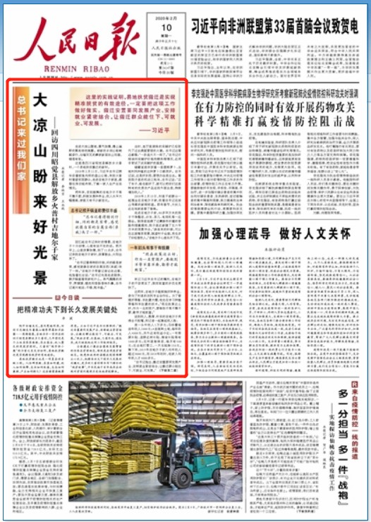 2月10日出版的《人民日?qǐng)?bào)》,在頭版刊登了《大涼山盼來(lái)好光景》的報(bào)道,聚焦四川昭覺(jué)縣解放鄉(xiāng)火普村易地扶貧搬遷,村民不等不靠不要,積極發(fā)展種養(yǎng)業(yè),彝家兒女奔向充滿(mǎn)希望的新生活。