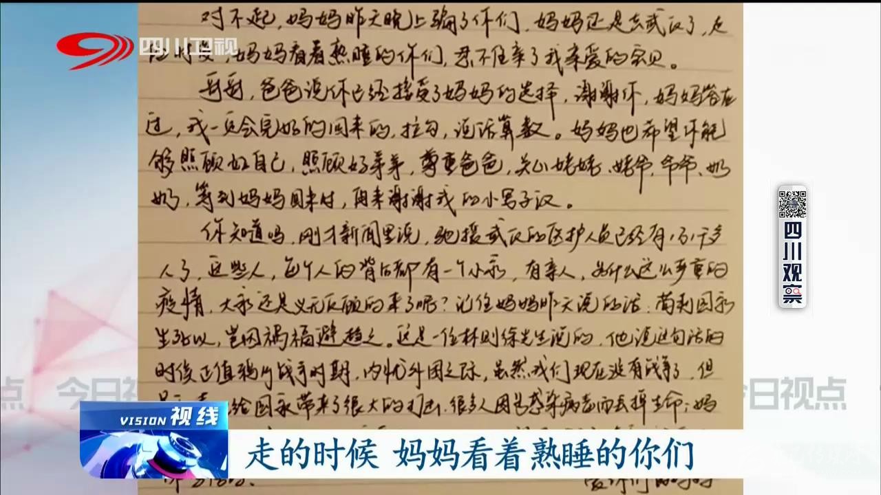 “媽媽還是騙了你,去了武漢,走的時(shí)候看到你們還在熟睡,忍不住親了我親愛(ài)的寶貝。哥哥,爸爸說(shuō)你已經(jīng)接受了***選擇,謝謝你,媽媽答應(yīng)過(guò)我一定會(huì)完好的回來(lái)的,拉鉤,說(shuō)話算話……”