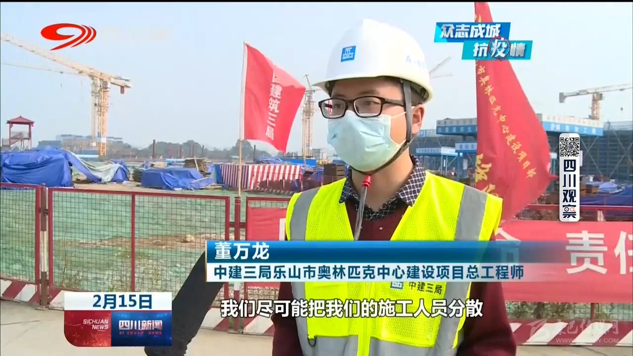 中建三局樂山市奧林匹克中心建設(shè)項目總工程師 董萬龍:“我們盡可能把我們的施工人員分散,不要聚集,對內(nèi)我們做好防控物資的保障,口罩、消毒水以及酒精這些防疫物資已經(jīng)齊全?!?/p>