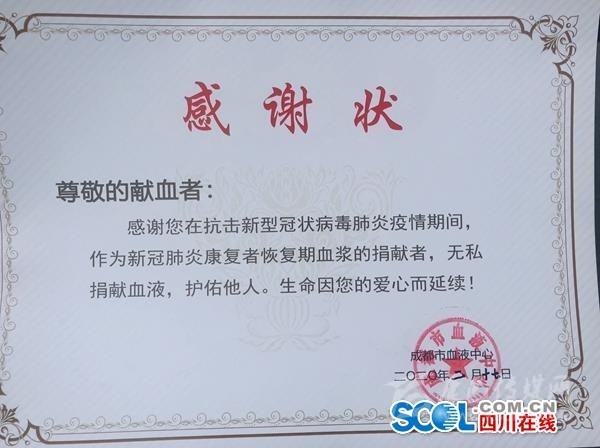 “出院的時(shí)候,我特地與我的主治醫(yī)生說,有相關(guān)的血液捐贈(zèng)或者其他配合的需求請(qǐng)隨時(shí)聯(lián)系我!”35歲的捐獻(xiàn)者李某表示,這是我首次獻(xiàn)血,我是湖北武漢人,有親戚朋友在成都,當(dāng)作成都是第二故鄉(xiāng),我是1月22日到成都探親,23日下午發(fā)熱在成都市公共衛(wèi)生臨床醫(yī)療中心確診和治療,2月6日出院。在出院治療期間,李某表示,最難忘的就是每次醫(yī)生來查房,都會(huì)鼓勵(lì)我說,放心你一定會(huì)康復(fù)的,“我難忘成都這份恩情!”