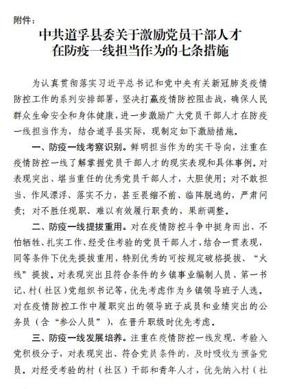 疾風知勁草,板蕩識誠臣。自新型冠狀病毒肺炎疫情防控阻擊戰(zhàn)打響以來,道孚縣各級黨組織和黨員、干部主動擔當作為,積極投入疫情防控最前線,為有力防控疫情蔓延作出重要貢獻。近日,道孚縣委印發(fā)《中共道孚縣委關(guān)于激勵黨員干部人才在防疫一線擔當作為的七條措施》,關(guān)心關(guān)愛、激勵引導廣大黨員、干部、各類人才在疫情防控一線履職盡責、擔當作為、安心戰(zhàn)斗。