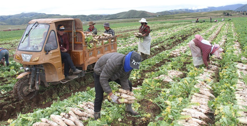 據(jù)蔬菜運(yùn)輸司機(jī)扎西說(shuō),他原是當(dāng)?shù)啬撩?,現(xiàn)在開(kāi)冷鏈車(chē),一車(chē)可裝白蘿卜27噸,每天大約有200余噸白蘿卜,被源源不斷地運(yùn)出去。他說(shuō),這片地原來(lái)是灘涂地,現(xiàn)在種蘿卜,每畝可收入1.8萬(wàn)元,“祖祖輩輩都沒(méi)想到,這荒地也能賺那么多錢(qián)。”