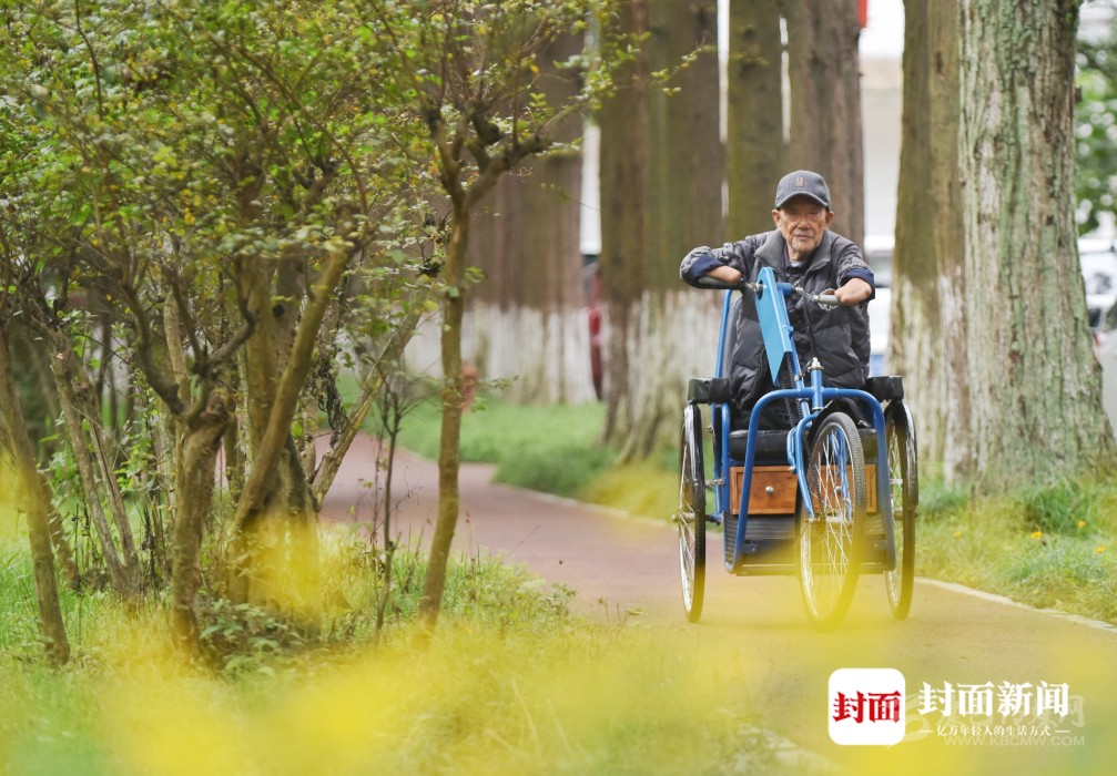 老人四肢殘缺,騎著特制的手搖三輪車,也能行動自如。距離老人被截肢已經(jīng)70年了,他早已學(xué)會獨(dú)立生活。
