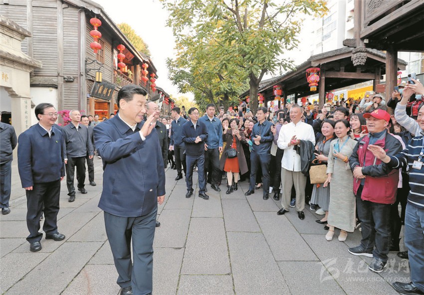 習(xí)近平在福州三坊七巷歷史文化街區(qū)考察時(shí),向游客和市民招手致意。