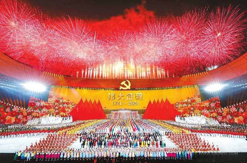 舞臺(tái)中央,3000多名紅衣青年舉起發(fā)光道具,組成熠熠發(fā)光的黨徽;“鳥(niǎo)巢”上空,絢爛的焰火升騰綻放,化作“100”的紀(jì)年字樣;紅色看臺(tái)上,觀眾的熱情被瞬間點(diǎn)燃,掌聲歡呼聲響徹夜空……