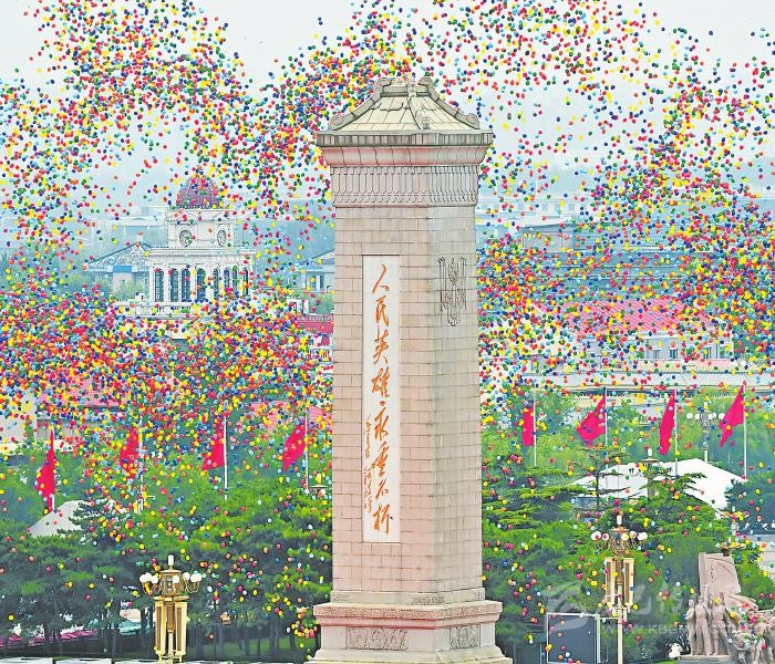 天安門城樓燈火璀璨,廣場(chǎng)上慶祝大會(huì)的準(zhǔn)備工作緊鑼密鼓。三軍儀仗隊(duì)、解放軍聯(lián)合軍樂(lè)團(tuán),還有北京各高校學(xué)生組成的合唱團(tuán),正在進(jìn)行最后的排練。