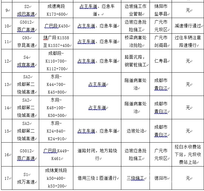 高速公路影響通行的施工及管制路段