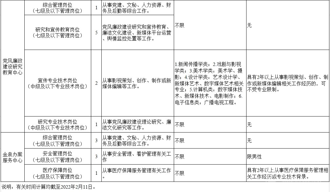 考調(diào)名額 考調(diào)事業(yè)人員25名。其中,信息技術(shù)中心管理崗位9名,黨風廉政建設研究教育中心管理崗位6名、專業(yè)技術(shù)崗位3名,金泉辦案服務中心管理崗位7名。 考調(diào)對象及條件 考調(diào)對象 全省范圍內(nèi)行政單位或參公事業(yè)單位一級主任科員(含)以下職級及相當職務層次人員;縣級及以上公益一類或全額撥款事業(yè)單位管理崗位七級及以下職員、專業(yè)技術(shù)崗位中級及以下工作人員。 考調(diào)條件 具有良好的政治素質(zhì)、專業(yè)素養(yǎng),品行端正,實績突出,群眾公認。 中共黨員。 全日制大學本科及以上學歷,并取得相應學士及以上學位。 年齡35周歲以下(1986年2月11日及以后出生)。 歷年年度考核均為合格(稱職)及以上。 身體心理健康,具有正常履行職責的身體條件和心理素質(zhì)。 符合報考崗位規(guī)定的資格條件,詳見《中共四川省紀委四川省監(jiān)委2022年公開考調(diào)事業(yè)人員崗位情況表》(附后)。 符合法律、法規(guī)規(guī)定的其他條件。 有關(guān)時間計算均截至2022年2月11日。 具有下列情形之一的,不得報考: 被依法列為失信聯(lián)合懲戒對象的。 涉嫌違紀違法正在接受有關(guān)專門機關(guān)審查尚未作出結(jié)論的。 受過黨紀政務處分或司法機關(guān)刑事處罰的。 受到誡勉、組織處理等影響期未滿或期滿影響使用的。 按照有關(guān)規(guī)定,到定向單位工作未滿服務年限或有其他限制性規(guī)定的。 尚在試用期的。 按照相關(guān)規(guī)定應當回避的。 法律、法規(guī)規(guī)定的其他情形。 報名及打印準考證 2022年2月22日上午8:00至2月26日下午18:00,報名人員登錄四川省人力資源和社會保障廳官網(wǎng)(http://rst.sc.gov.cn/)首頁“人事考試”專欄進行網(wǎng)上報名,每人限報一個崗位。 對報名人員進行網(wǎng)上資格初審,通過資格初審者可于2022年3月1日上午8:00至3月2日下午18:00,登陸報名系統(tǒng)打印筆試準考證。 考試 考試分筆試和面試。其中,信息技術(shù)崗位A、信息技術(shù)崗位B、宣傳專業(yè)技術(shù)崗位需加試專業(yè)測試。 根據(jù)筆試情況,擇優(yōu)確定進入面試的人選,并適時開展資格復審和心理素質(zhì)測試。資格復審、心理素質(zhì)測試、面試時間和地點另行電話通知。 考察、體檢及試用 考察 根據(jù)考試情況,擇優(yōu)差額確定進入考察對象,深入考察了解人選政治表現(xiàn)、工作能力、廉潔自律和性格特點等。 體檢 根據(jù)考察情況和職位要求,擇優(yōu)等額確定進入體檢人選,參照《公務員錄用體檢通用標準(試行)》進行體檢。 頂崗試用 綜合人選考試成績、考察情況,根據(jù)工作需要和人崗相適原則,擇優(yōu)確定頂崗試用人選。 調(diào)入 試用期滿后,根據(jù)考調(diào)名額和試用期間表現(xiàn),研究確定擬調(diào)人員,經(jīng)公示后按規(guī)定程序辦理調(diào)入手續(xù)。 注意事項 報考者應保證提供真實、準確、全面的個人信息和資料,如有弄虛作假的行為,將按有關(guān)規(guī)定嚴肅處理。 資格審查貫穿考調(diào)全過程,任一環(huán)節(jié)發(fā)現(xiàn)有不符合考調(diào)條件的,取消考調(diào)資格。 報名時請按要求填寫本人手機號碼,并保持通訊暢通。未入圍下一環(huán)節(jié)人員,不再另行通知。 進入資格復審者,需由有干部管理權(quán)限的主管部門出具同意考調(diào)的書面意見并加蓋公章。 嚴明考調(diào)紀律,報名者不得托人說情、打招呼,一經(jīng)發(fā)現(xiàn)即取消資格。 遵守疫情防控相關(guān)規(guī)定,服從工作人員安排。 同時,四川省紀委監(jiān)委還提供相關(guān)咨詢電話:028—62555435;62555354。 (點擊查看大圖)