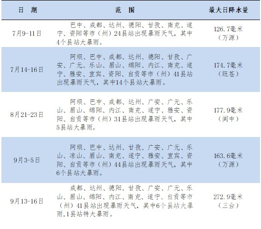 巴中、達州、廣安、南充、遂寧、資陽、內(nèi)江和綿陽8市有15縣站突破本站年降水量歷史最多記錄。