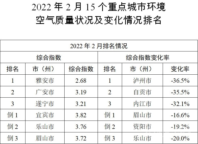 四川省生態(tài)環(huán)境廳副廳長李銀昌介紹,今年2月,全省15個重點(diǎn)城市環(huán)境空氣質(zhì)量均呈改善趨勢,改善同比較好的前3名依次為瀘州市、自貢市、內(nèi)江市,改善同比較好的后3名依次為眉山市、資陽市、樂山市。6個非重點(diǎn)城市空氣質(zhì)量綜合指數(shù)排名依次為甘孜州、阿壩州、涼山州、巴中市、廣元市、攀枝花市。